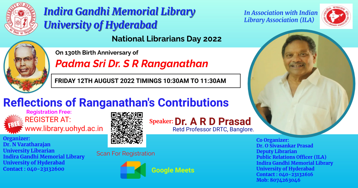 Webinar on National Librarian Day - "REFLECTIONS OF RANGANATHAN'S CONTRIBUTIONS" by A R D PRASAD, DRTC BANGALORE. 12TH AUG 2022. Friday. CLICK FOR FREE REGISTRATION